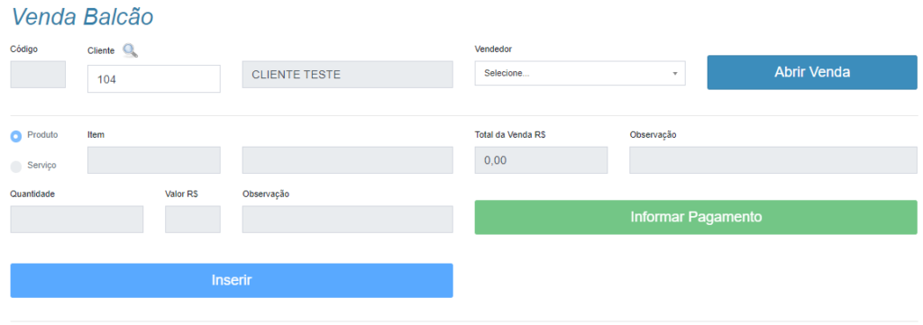 Clique em "Abrir Venda" para inserir o cliente e ir para a aba de produtos.