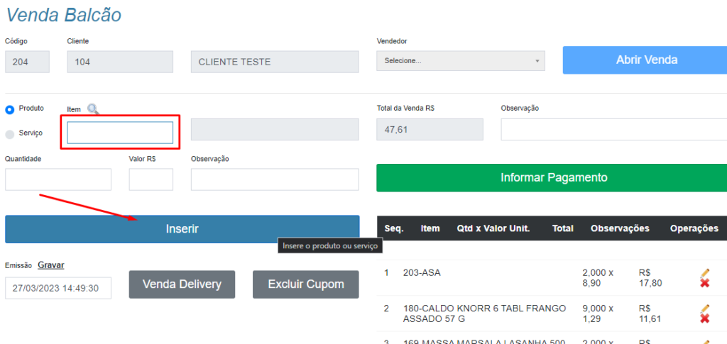 3º Passo: Selecione os item que o cliente solicitou, indicando o peso(KG) ou a quantidade de unidade(UN) e clique em "Inserir":