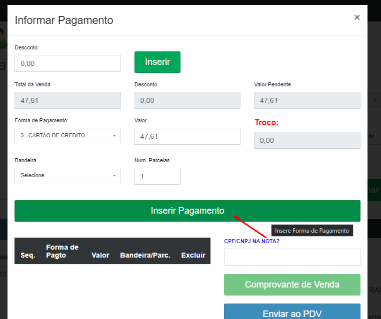 Observação: Se você inserir o pagamento e clicar em "Exportar ao PDV", a venda também será finalizada.